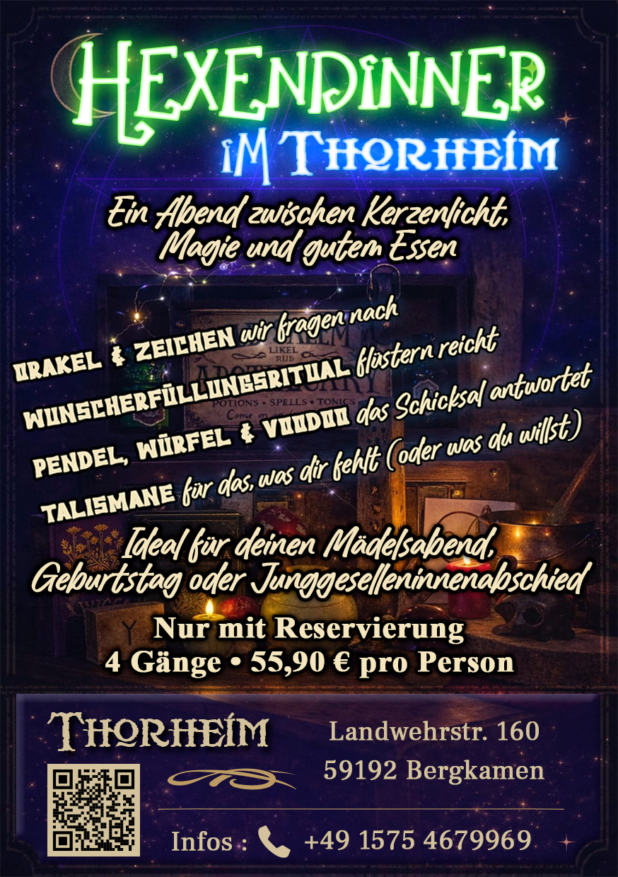 Bei unserem Hexendinner werdet Ihr nicht nur leiblich verwöhnt, sondern auch magisch unterhalten – ein Fest für Gaumen, Geist und Seele.